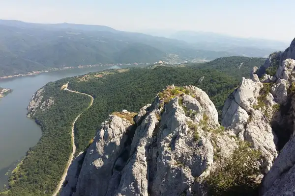 Description: From the main road (Donji Milanovac – Kladovo), through the place called Golo Brdo, passing the forests of National Park Djerdap, you will get to the viewpoint Mali Štrbac. This viewpoint is situated 626 m above the sea level, from where there is a beautiful view on Iron Gates gorge, Mraconia Monastery and the Statue of Decebal Rex carved in s rock on thr Romanian side of the Danube river .