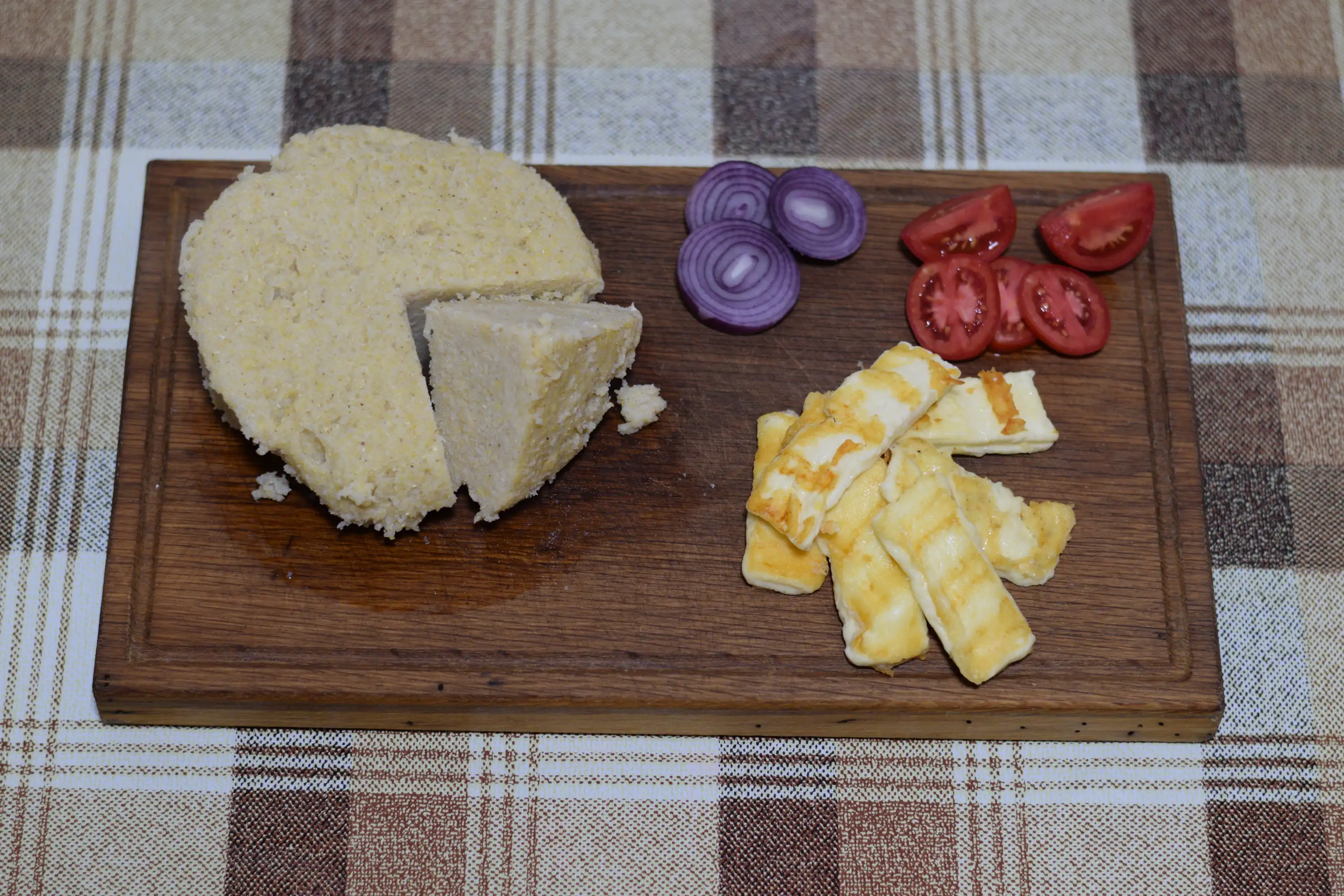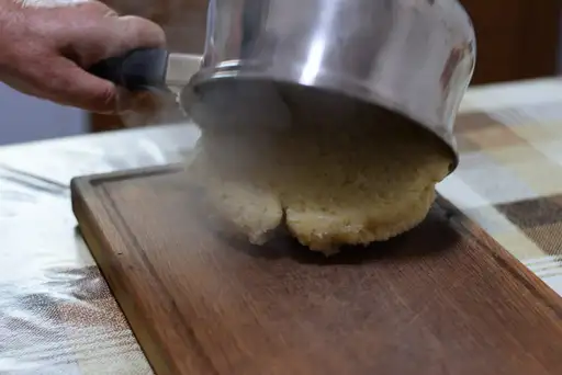 Polenta: Put 3 cups of water in the pot to boil. After that, a pinch of salt (or spoon) is added. When all this is done, the temperature is reduced to a minimum and one cup of corn flour is mixed with constant stirring. polenta is finished when the whole mass rejoins and becomes thick. Turn the pan upside down on the plate and serve it. While baking polenta, it is recommended to use a wooden spoon, due to the oxidation of a metal spoon.