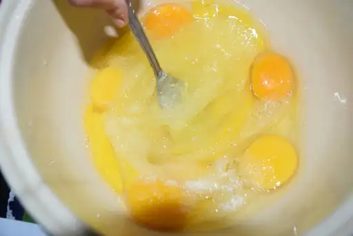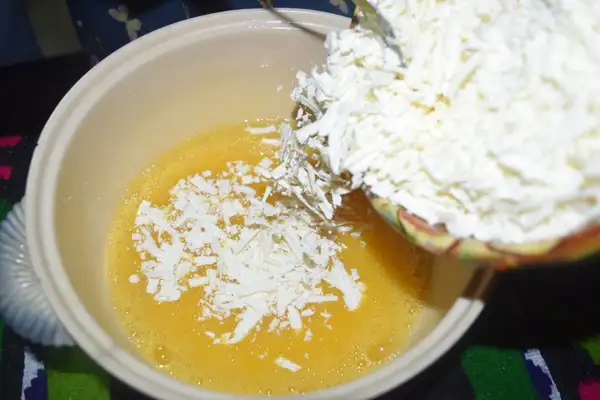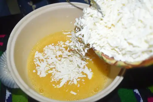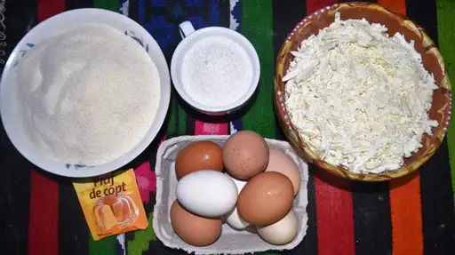 Ingredients: 8 eggs, 1 bowl of grated cheese (the cheese can be sweet or sour or a combination of the two types, according to preferences), 1 teabag of baking powder or 1 cube of yeast, sugar according to taste, semolina as needed