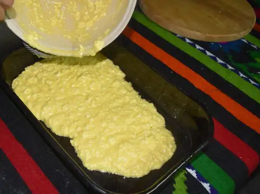 Method of Preparation: The eggs are mixed together with the sugar and a little salt. The baking powder is extinguished in a little soda or mineral water. If the yeast is used instead of the baking powder, it dissolves in a little warm water. The cheese and a little semolina are placed over the egg and sugar mixture, it is mixed thoroughly, and then the baking powder or the yeast dissolved in warm water is added. Everything is mixed again and the semolina is added until a homogeneous composition, as thick as the one for the cake is obtained. The composition is placed in the baking tray and baked in the oven until it is browned on top.