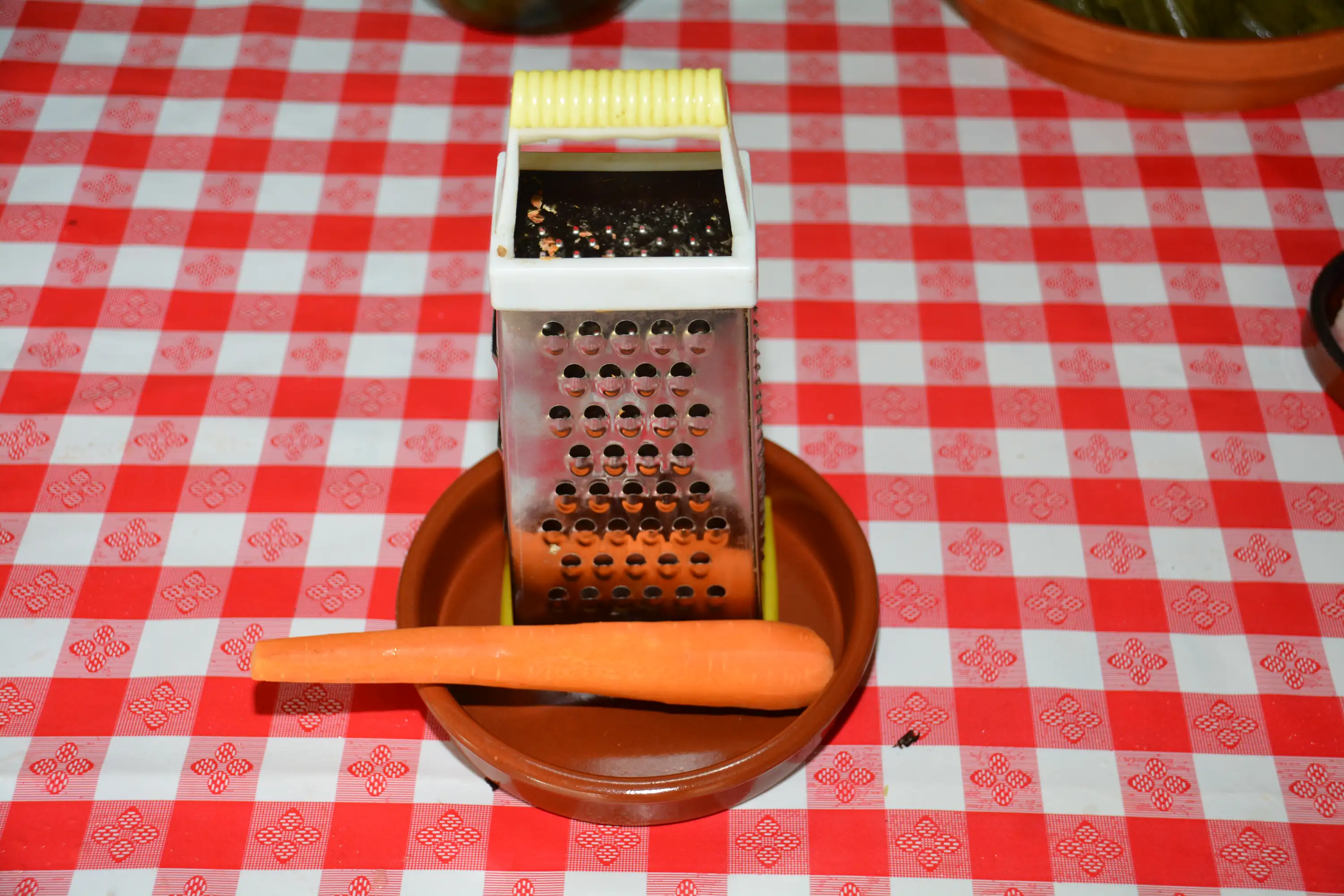 Ingredients: vine leaves (25-30), minced meat (600g.), Onion (150g.), 1 carrot, sunflower oil (0.150l) rice (100g.), Sour cream (250g), bacon (200g.), 1 egg and spices: salt, pepper, paprika powder, bay leaf.