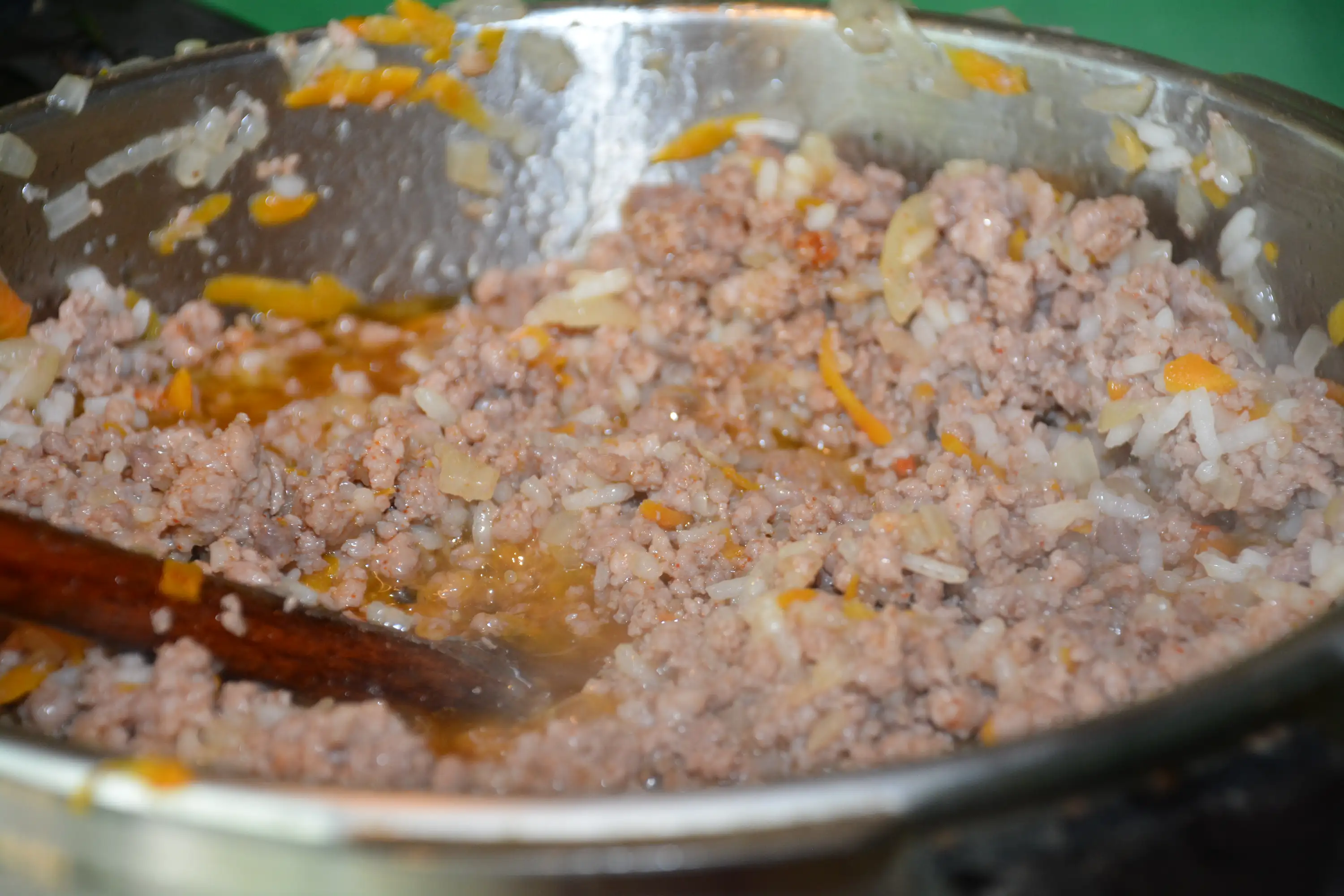 bacon are mixed with fried onion and carrot. Add rice, spices (sweet pepper, salt, pepper) and a raw