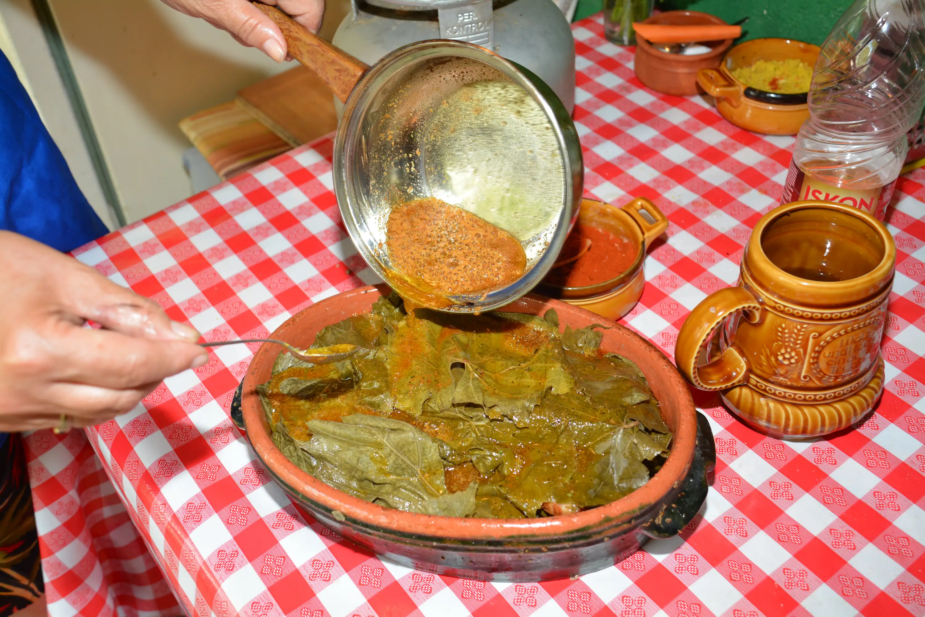 egg to bind the composition. Wrap the sarma and place them on a row in a ceramic pot. Bunch of slices of bacon can be placed between the rows. Add 3-4 vine leaves in the bowl. Boil the dish on small fire or in the oven.
